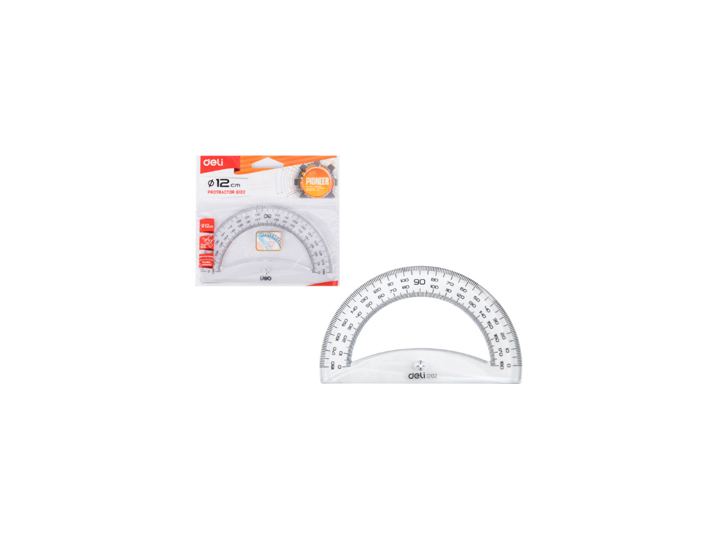 Úhloměr DELI 180° je vhodný pro přesné měření a rýsování úhlů ve škole i doma. Je vyroben z odolného materiálu, který zajišťuje dlouhou životnost i při každodenním používání.